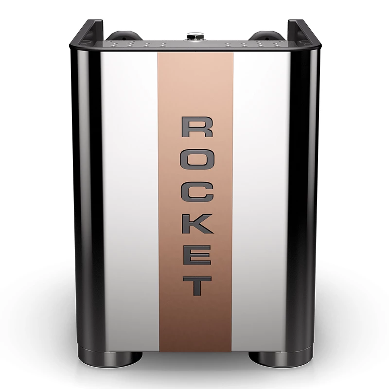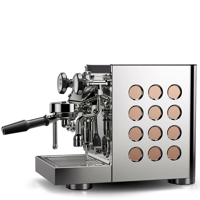 Besonders beeindruckend sind die zwölf Kreise auf beiden Seiten der Maschine, die bei der TCA nochmals weiter in ihrer Prägung bearbeitet wurden. Dadurch wirken sie noch dreidimensionaler und kommen noch besser zur Geltung. Die Rocket Appartamento TCA ist somit nicht nur ein absoluter Hingucker, sondern auch eine Maschine, die höchste Ansprüche an die Kaffeequalität erfüllt. Die vertikale Ausrichtung des Rocket Espresso-Logos auf der Rückseite der Maschine rundet das moderne Erscheinungsbild perfekt ab.
