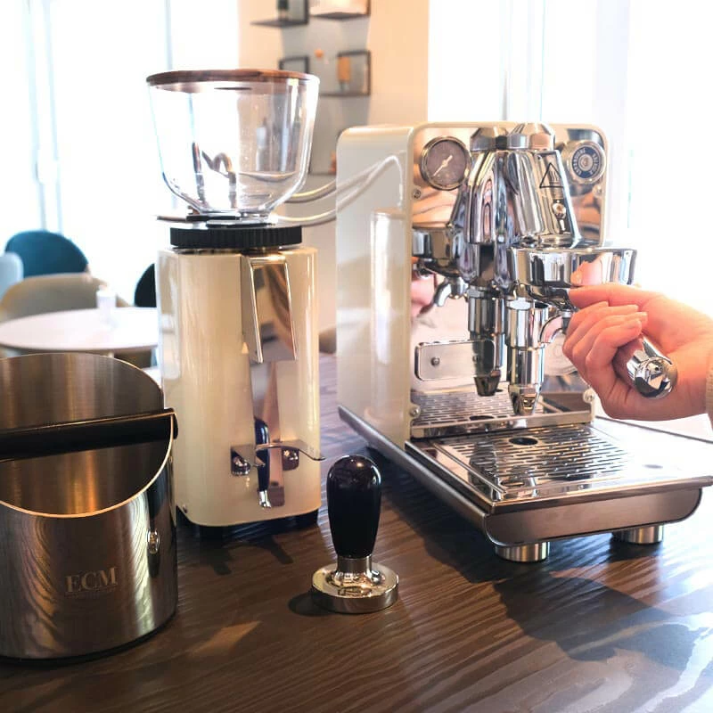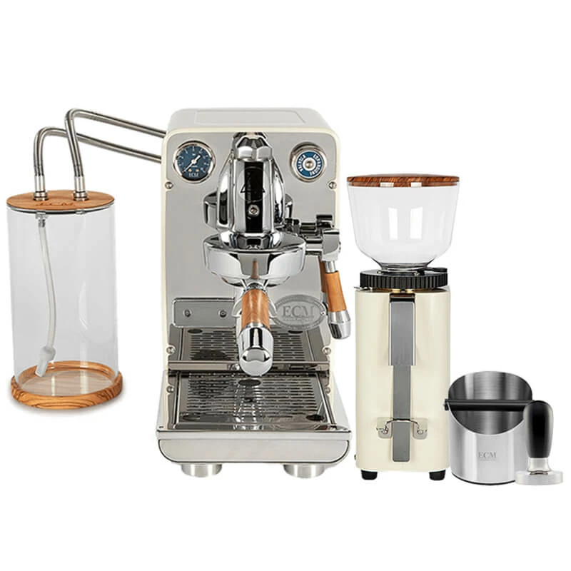Mit diesem Bundle bekommen Espressofans alles, was sie brauchen, um direkt loszulegen. Das cremefarbene Duo aus der ECM Puristika und der ECM C-Manuale 54 überzeugt neben der einzigartigen Ästhetik im perfekt abgestimmten Retrolook auch durch hochwertige Verarbeitung und einfache Bedienung. Zusätzlich sind im Bundle ein Tamper und eine Abschlagbox, ebenfalls vom Heidelberger Premiumhersteller ECM, enthalten.